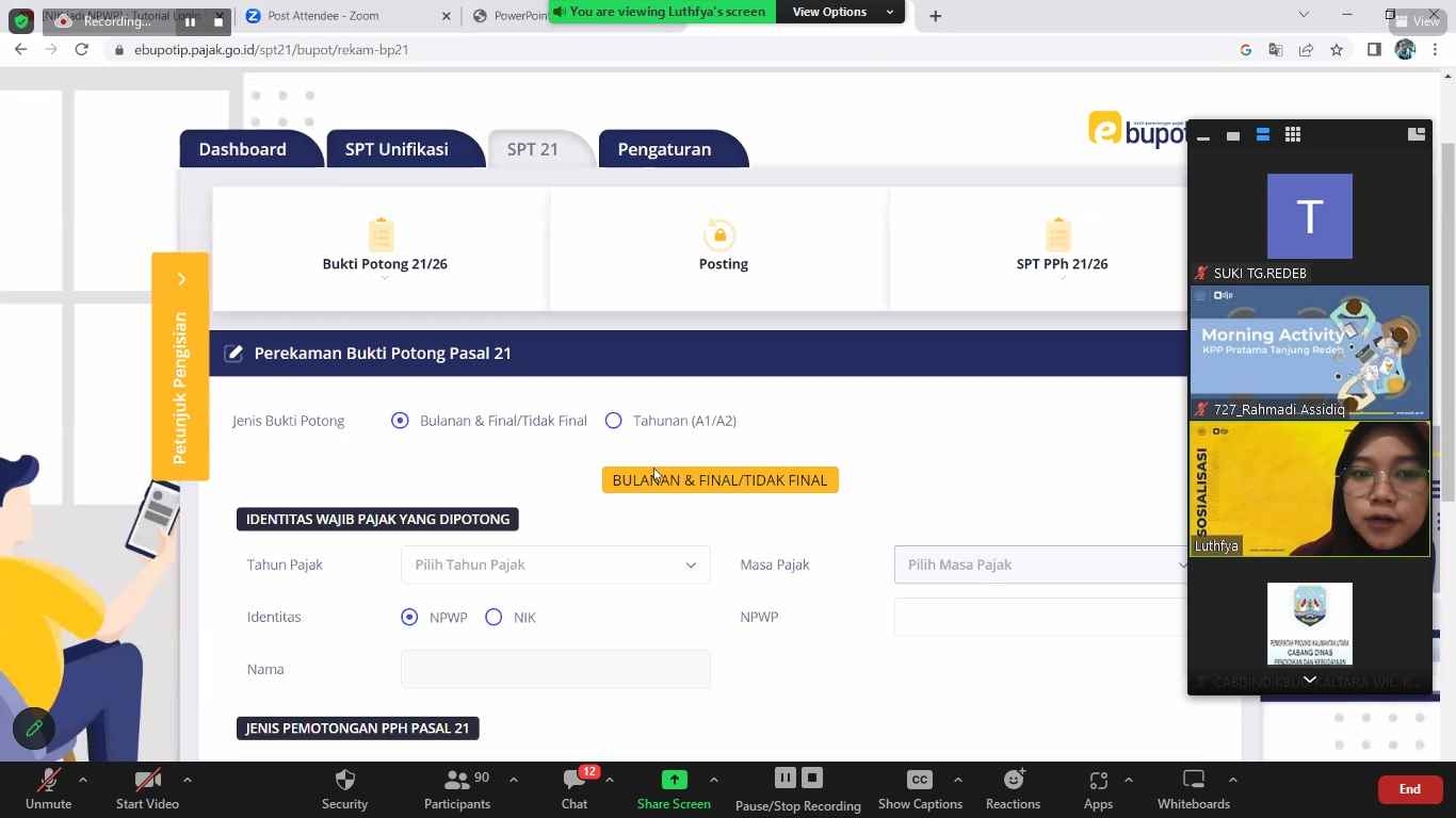 Dalam kelas pajak yang dipandu oleh Penyuluh Pajak Luthfyana Herindawati, serta pelaksana Seksi Pelayanan Rahmadi Assidiq Khaliq membahas seputar Validasi NIK serta Pembuatan Bukti Potong 1721-A2 .