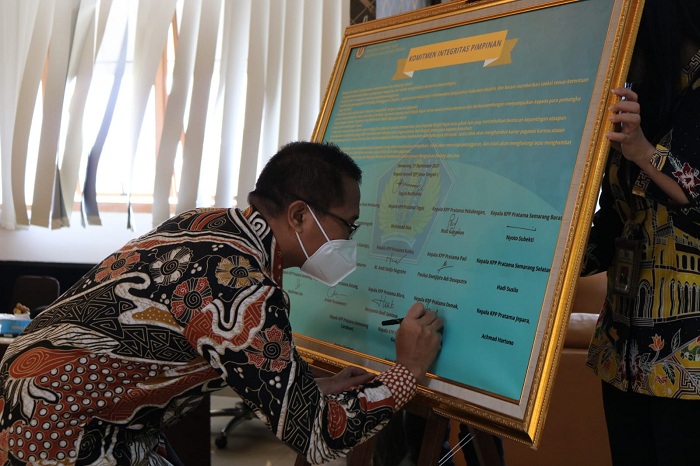 Kanwil DJP Jawa Tengah I melaksanakan Program Komitmen Integritas Pimpinan (KIP) secara luring di ruang aula lantai 7 Gedung Keuangan Negara (GKN) II Semarang (Selasa, 21/9). Kegiatan ini dilaksanakan guna menanamkan pemahaman mengenai pentingnya peran pimpinan dalam meningkatkan komitmen integritas dan menjadi role model di unit kerja,