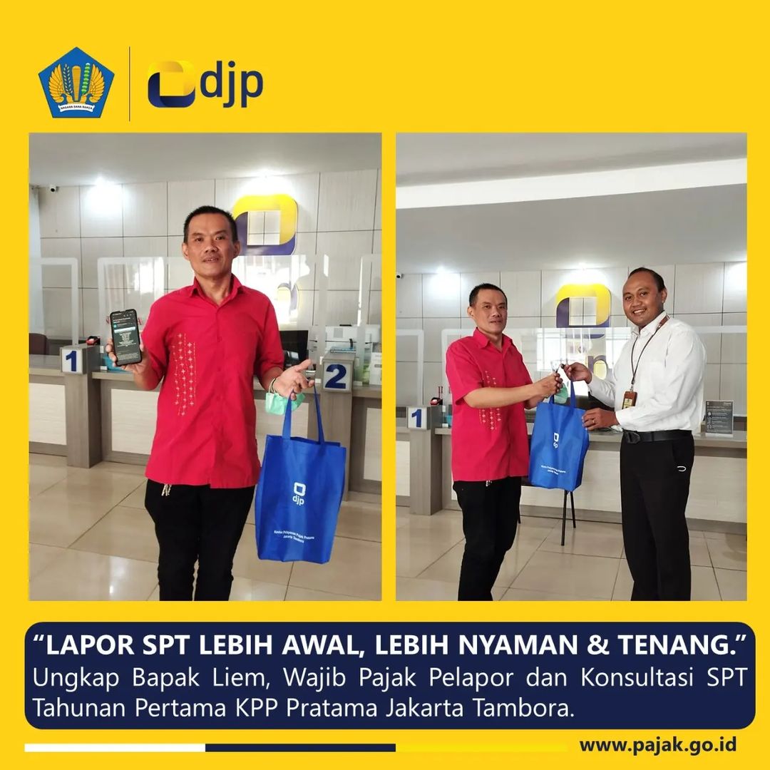 Kantor Pelayanan Pajak (KPP) Pratama Jakarta Tambora memberikan apresiasi kepada Liem Alex sebagai wajib pajak pertama tahun 2023 yang melakukan konsultasi dan menyampaikan SPT Tahunan secara langsung di Loket Helpdesk KPP Pratama Jakarta Tambora (Senin, 2/1).