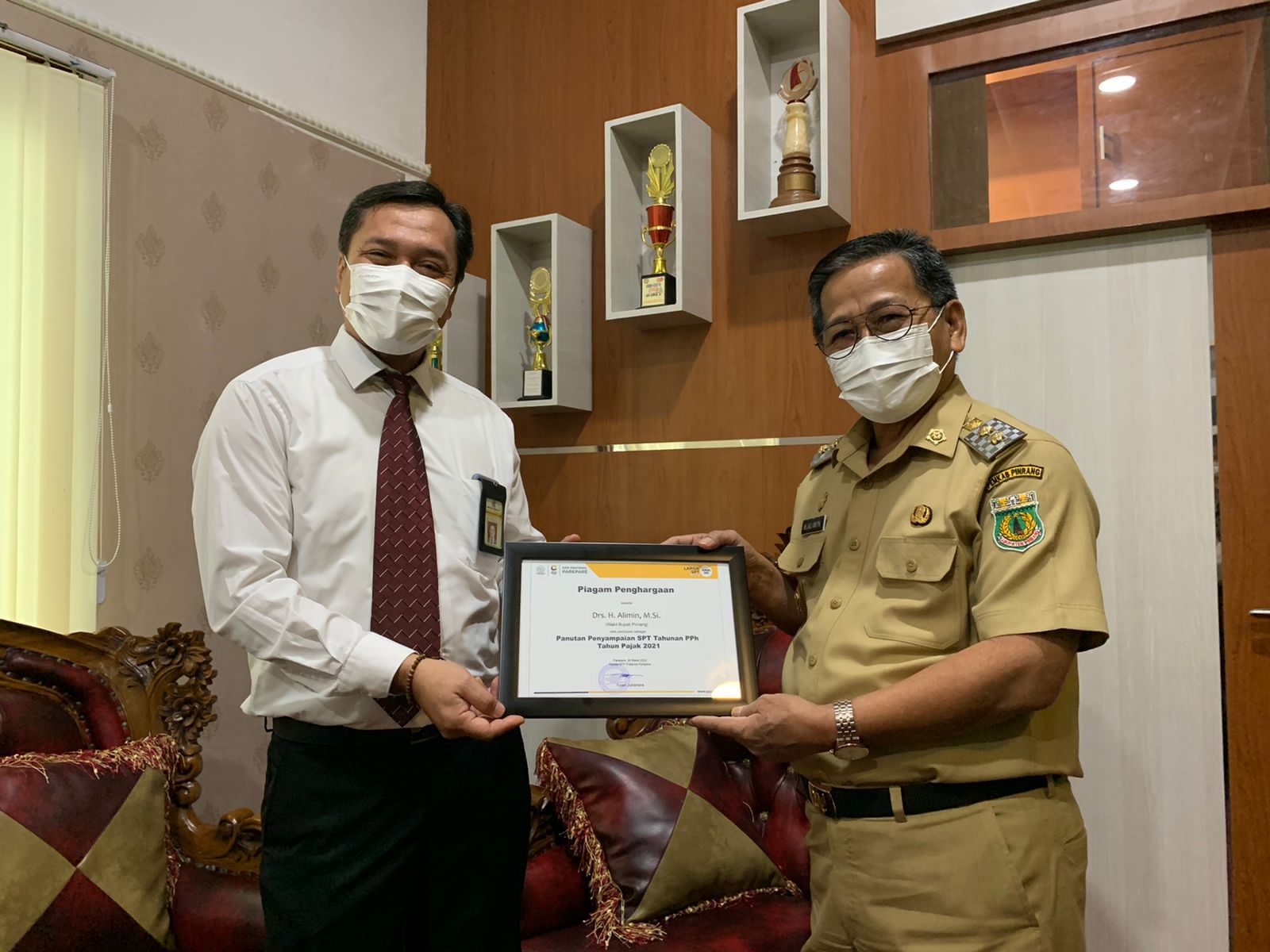 Dalam kesempatan ini, perwakilan KPP Pratama Parepare dan KP2KP Pinrang memberikan apresiasi pada Alimin dengan bentuk seremonial penyerahan piagam penghargaan.