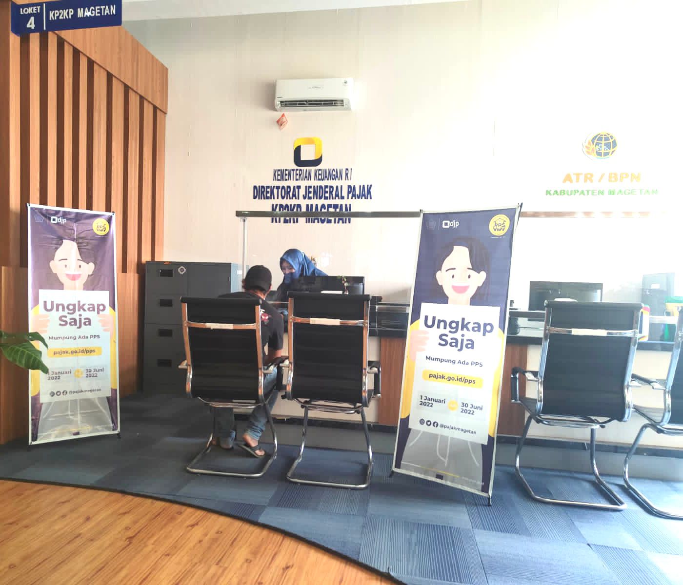 Kantor Pelayanan, Penyuluhan dan Konsultasi Perpajakan (KP2KP) Magetan membuka layanan Program Pengungkapan Sukarela (PPS) di loket Mal Pelayanan Publik (MPP) Kabupaten Magetan (Rabu 22/6). Layanan ini dibuka setiap hari kerja Senin-Jumat dengan jam layanan mulai 08.00-15.00 WIB.