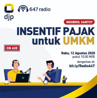Bertindak selaku host adalah Dhamas Surya Sundaru dengan narasumber Anton Sugiarto. Keduanya adalah Account Representative Seksi Ekstensifikasi dan Penyuluhan KPP Pratama Ponorogo. Pada kesempatan tersebut, Anton Sugiarto memberikan beberapa informasi terkait Insentif Pajak bagi UMKM kepada seluruh pendengar 647Radio, terutama kepada para pelaku UMKM yang terdampak pandemi Covid-19.