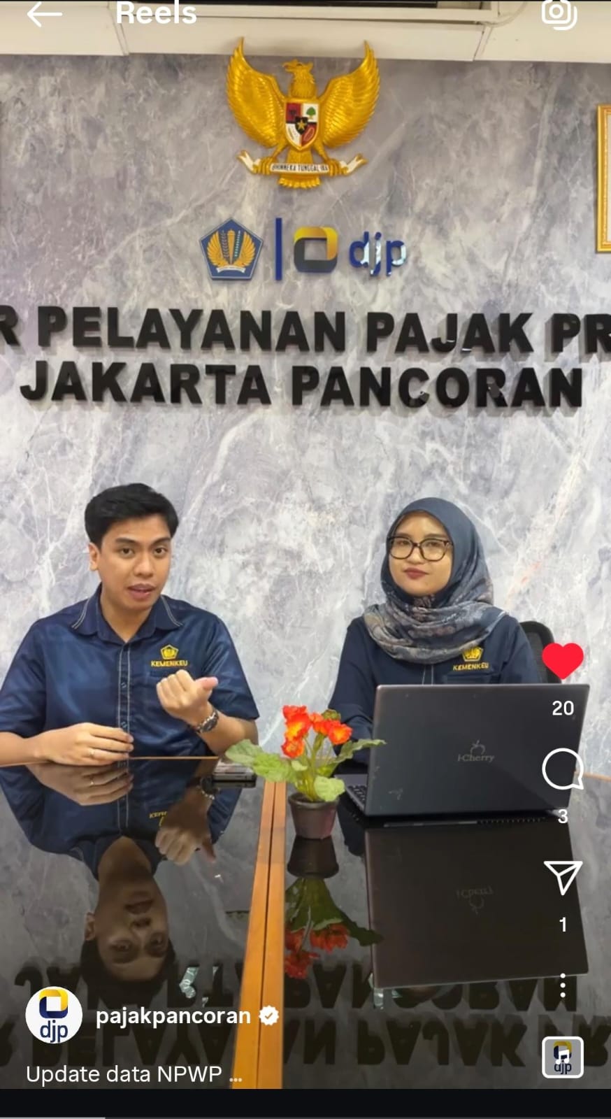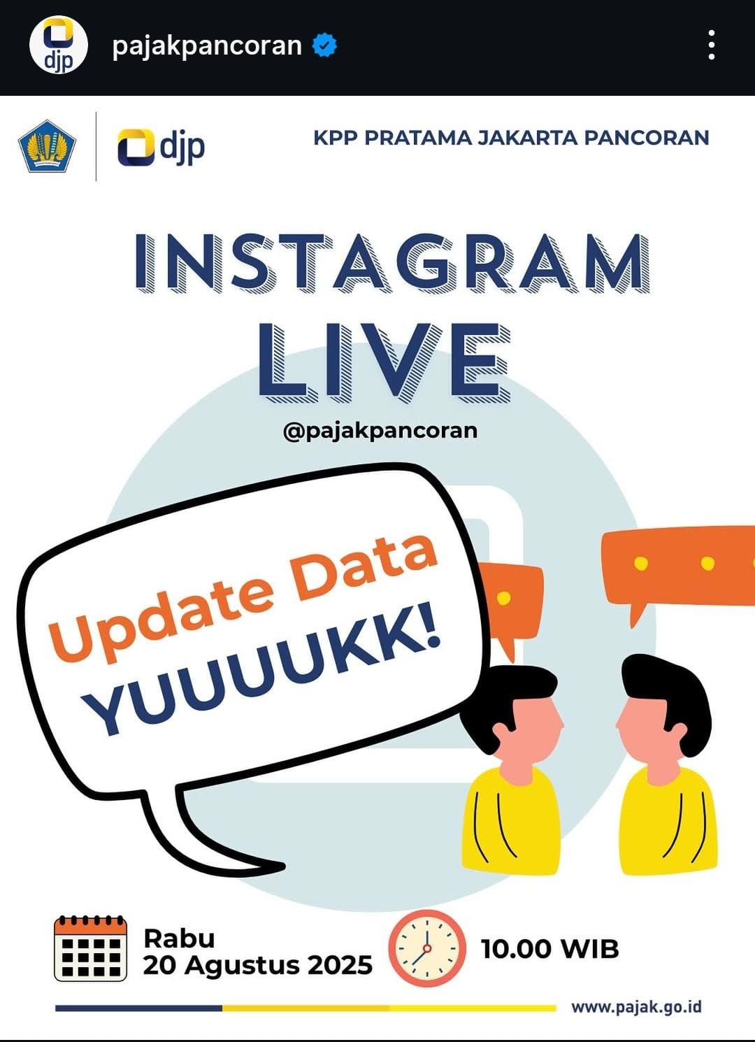 Kantor Pelayanan Pajak (KPP) Pratama Jakarta Pancoran menggelar siaran langsung bertajuk InsTaxLive dengan topik Update Data Wajib Pajak melalui akun Instagram resmi @pajakpancoran pada Rabu (20/8).