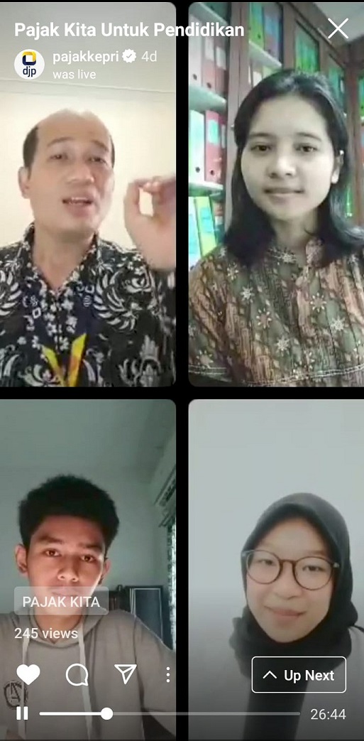 Kantor Wilayah Direktorat Jenderal Pajak Kepulauan Riau (Kanwil DJP Kepri) menggelar bincang pajak melalui siaran langsung pada platform Instagram @pajakkepri dengan tema Pajak Kita untuk Pendidikan di kota Batam, Kepulauan Riau (Jumat, 17/9). Kegiatan ini bertujuan untuk mengedukasi generasi muda memahami peran pajak dalam dunia pendidikan.