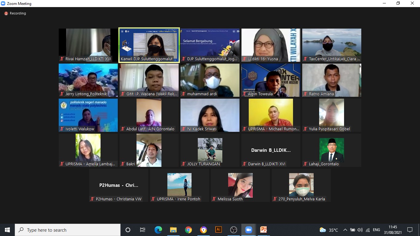 Kantor Wilayah Direktorat Jenderal Pajak Sulawesi Utara, Tengah, Gorontalo, dan Maluku Utara (Kanwil DJP Suluttenggomalut) mengadakan koordinasi dan sharing session Program Inklusi Kesadaran Pajak secara daring bersama 5 (lima) Perguruan Tinggi di Wilayah Kanwil DJP Suluttenggomalut (Selasa, 31/8).
