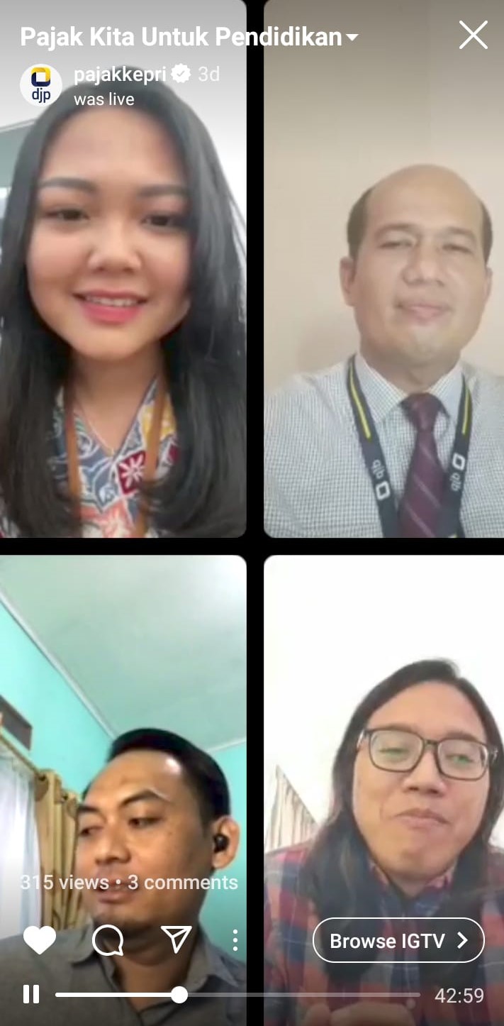 Kantor Wilayah Direktorat Jenderal Pajak Kepulauan Riau (Kanwil DJP Kepri) menggelar edukasi perpajakan melalui siaran langsung pada akun Instagram @pajakkepri dengan tema Pajak Kita untuk Pendidikan di Kota Batam, Kepulauan Riau (Jumat, 24/9).