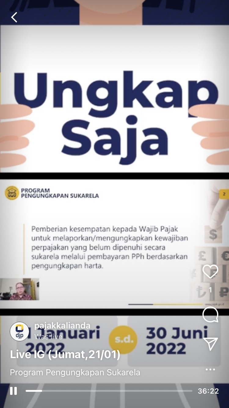 Kegiatan yang berlangsung dari pukul 09.00 hingga 11.00 WIB ini bertujuan untuk menjelaskan pentingnya mengikuti Program Pengungkapan Sukarela (PPS). Narasumber pada Live Instagram kali ini adalah Bendaharawan KP2KP Kalianda Idham Saleh Triraharjo.