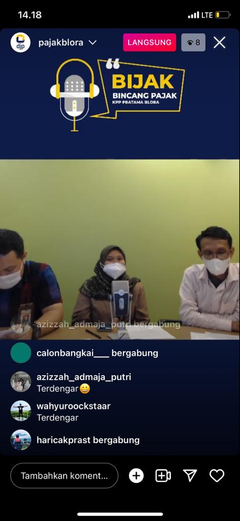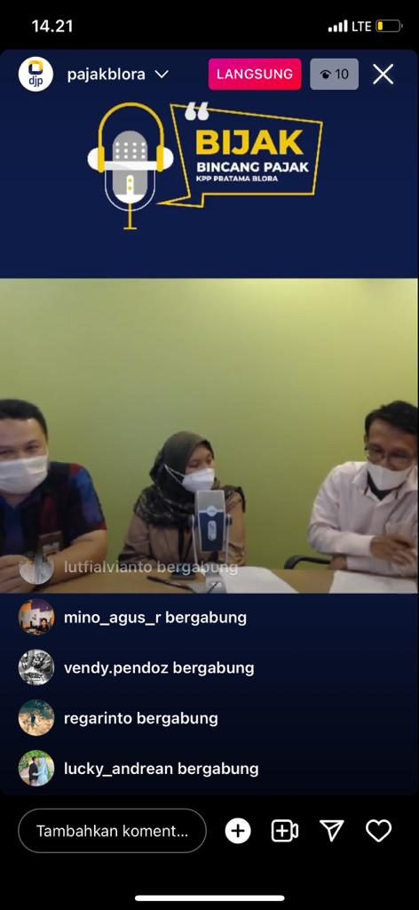 Kantor Pelayanan Pajak (KPP) Pratama Blora menyapa wajib pajak di Instagram melalui fitur live di akun @pajakblora, Blora (Kamis, 19/5). Kegiatan berlangsung selama 45 menit dan diikuti oleh 10 peserta.