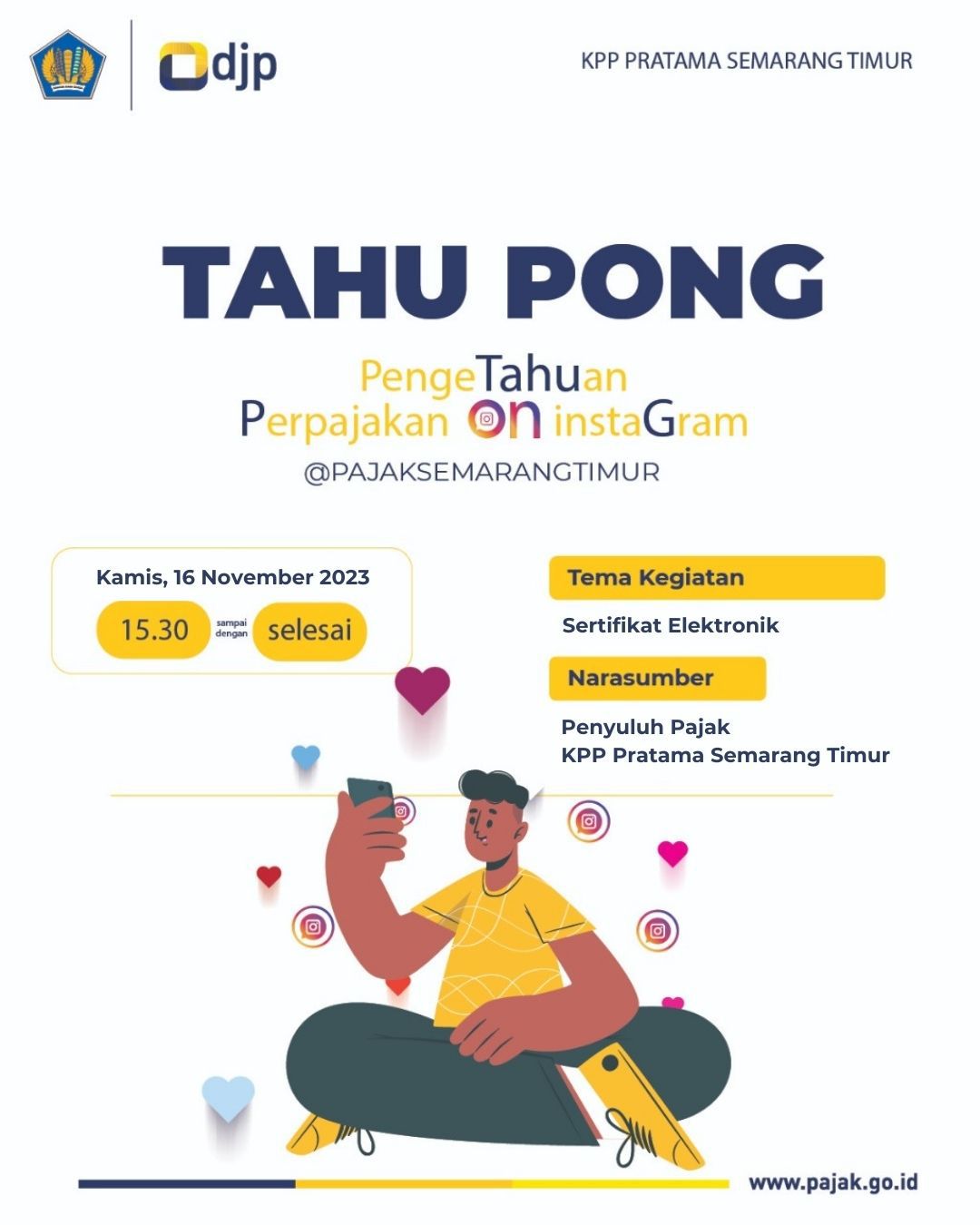 Kantor Pelayanan Pajak (KPP) Pratama Semarang Timur kembali menyapa kawan pajak melalui Live IG “Tahu Pong” Pengetahuan Pajak On Instagram dengan tema Sertifikat Elektronik (Kamis, 16/11).