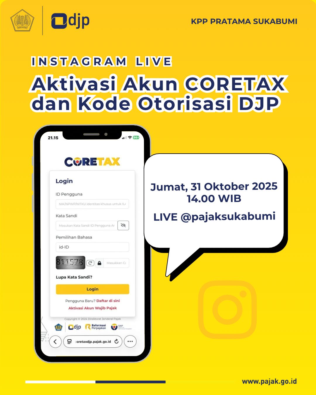 Kantor Pelayanan Pajak (KPP) Pratama Sukabumi kembali menggelar siaran langsung melalui akun Instagram @pajaksukabumi (Jumat, 31/10). Siaran langsung tersebut mengangkat tema Aktivasi Akun Coretax dan Kode Otorisasi DJP dengan menghadirkan narasumber Dimas Riandra Putra dan Dede Riadi selaku Penyuluh Pajak.