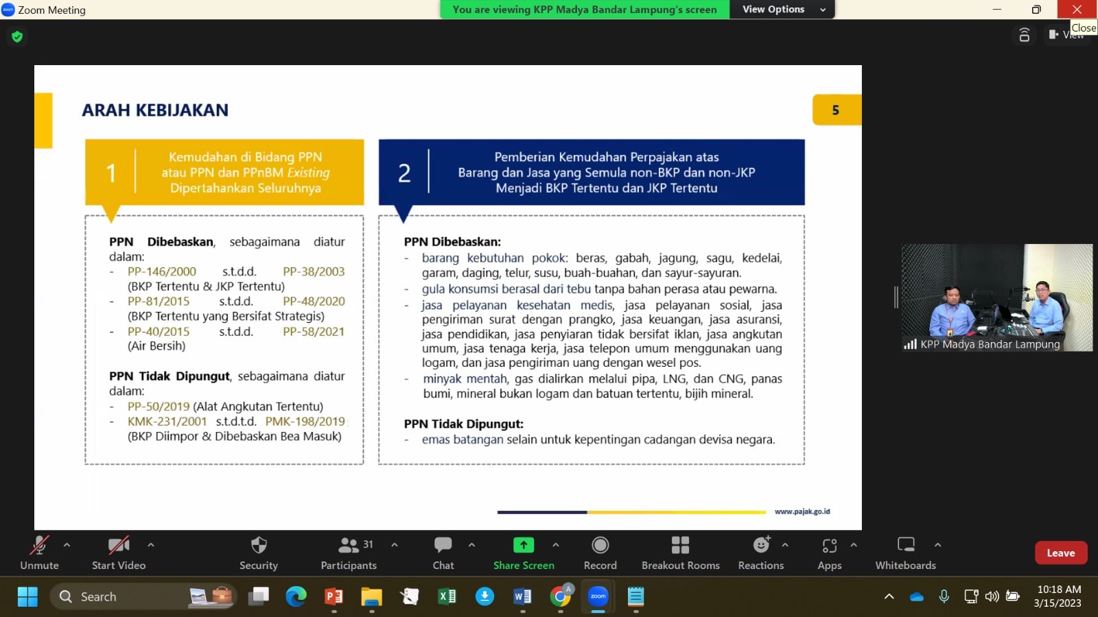 Kantor Pelayanan Pajak (KPP) Madya Bandar Lampung menyelenggarakan kegiatan edukasi perpajakan secara daring dengan tema Sosialisasi Peraturan Pemerintah (PP) Nomor 49 Tahun 2022 Tentang Pajak Pertambahan Nilai dibebaskan dan Pajak Pertambahan Nilai atau Pajak Pertambahan Nilai dan Pajak Penjualan atas Barang Mewah Tidak Dipungut atas Impor dan/atau Penyerahan Barang Kena Pajak Tertentu dan/atau Penyerahan Jasa Kena Pajak Tertentu dan/atau Pemanfaatan Jasa Kena Pajak Tertentu dari Luar Daerah Pabean di Ruang Studio KPP Madya Bandar Lampung, Kota Bandar Lampung (Rabu, 15/3).