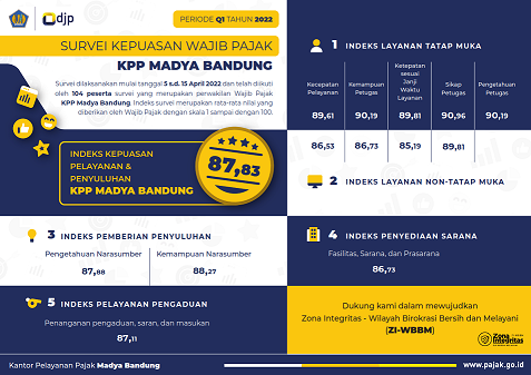 Hasil survei menunjukan, indeks kepuasan pelayanan dan penyuluhan wajib pajak KPP Madya Bandung berada pada angka 87,83 dalam skala nilai 0-100. Nilai tersebut diperoleh berdasarkan lima aspek utama yang menjadi dasar pelaksanaan survei ini yaitu indeks layanan tatap muka, layanan non tatap muka, pemberian penyuluhan, penyediaan sarana, serta pelayanan pengaduan. Selain itu, wajib pajak juga dapat menuliskan saran dan apresiasi atas layanan di KPP Madya Bandung.