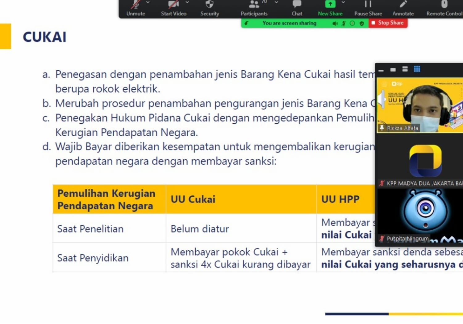 Kantor Pelayanan Pajak Madya Dua Jakarta Barat menyelenggarakan sosialisasi perpajakan terkait berlakunya Undang-Undang nomor 7 Tahun 2021 tentang Harmonisasi Peraturan Perpajakan kepada seluruh Wajib Pajak terdaftarnya secara daring melalui aplikasi Zoom di Jakarta (Kamis, 25/11).