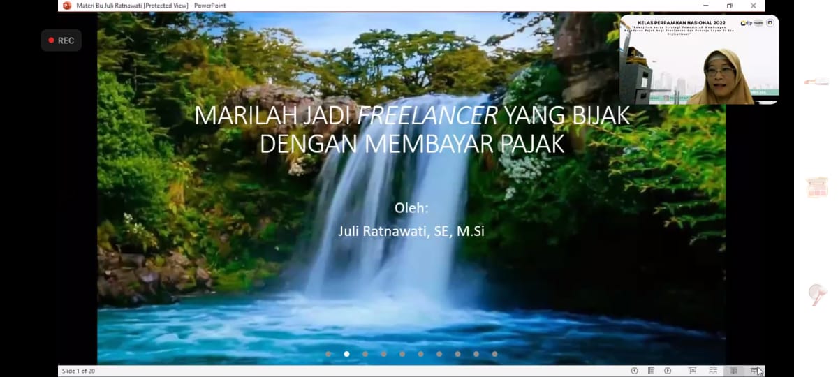 Pada sesi berikutnya, Kanwil DJP Jateng I melalui fungsional penyuluh perpajakan, Sri Juaeni dan Rizky Kherosinta menyampaikan materi mengenai kewajiban perpajakan. Tim penyuluh menjelaskan tentang apa saja yang harus dipahami seorang pekerja lepas dan peranan pemerintah dalam perkembangan profesi pekerja lepas di era digitalisasi. Selama tiga jam webinar ini berlangsung dan ditutup dengan sesi tanya jawab.