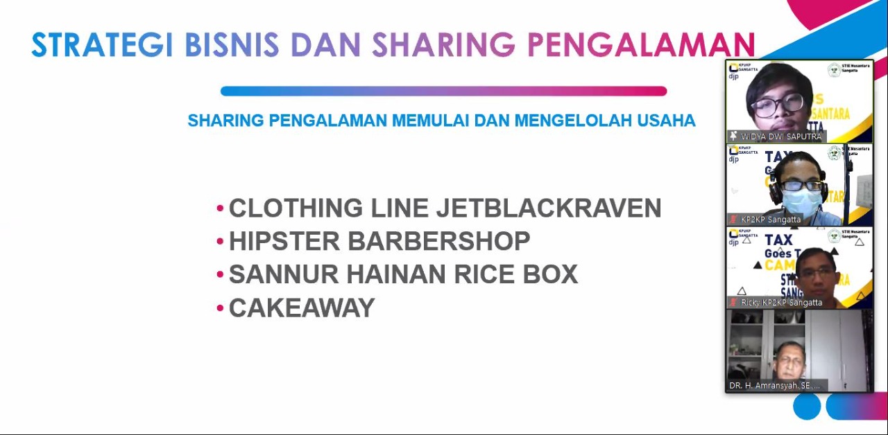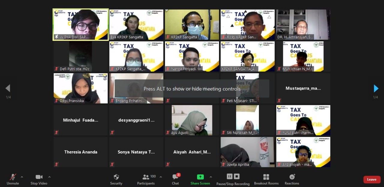 Sebanyak 100 Mahasiswa Sekolah Tinggi Ilmu Ekonomi (STIE) Nusantara Sangatta mengikuti acara Tax Goes To Campus (TGTC) yang diselenggarakan oleh Kantor Pelayanan Penyuluhan dan Konsultai Perpajakan (KP2KP) Sangatta secara daring (Rabu, 31/6).