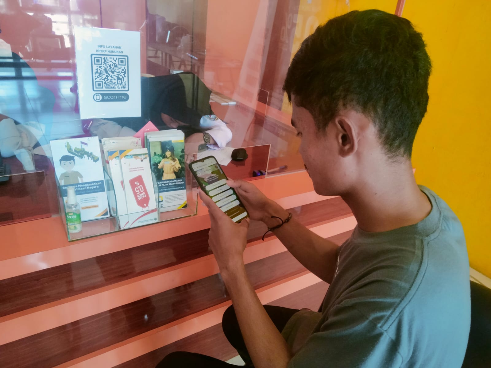 Wajib pajak manfaatkan layanan QR Code di Pos Pelayanan Perpajakan Pulau Sebatik, Kab. Nunukan (Selasa, 13/9). Wajib pajak tersebut bernama Imran. Kala itu, Imran baru saja selesai mengurus pendaftaran Nomor Pokok Wajib Pajak (NPWP). Kemudian ia bertanya kepada petugas tentang QR Code tersebut.