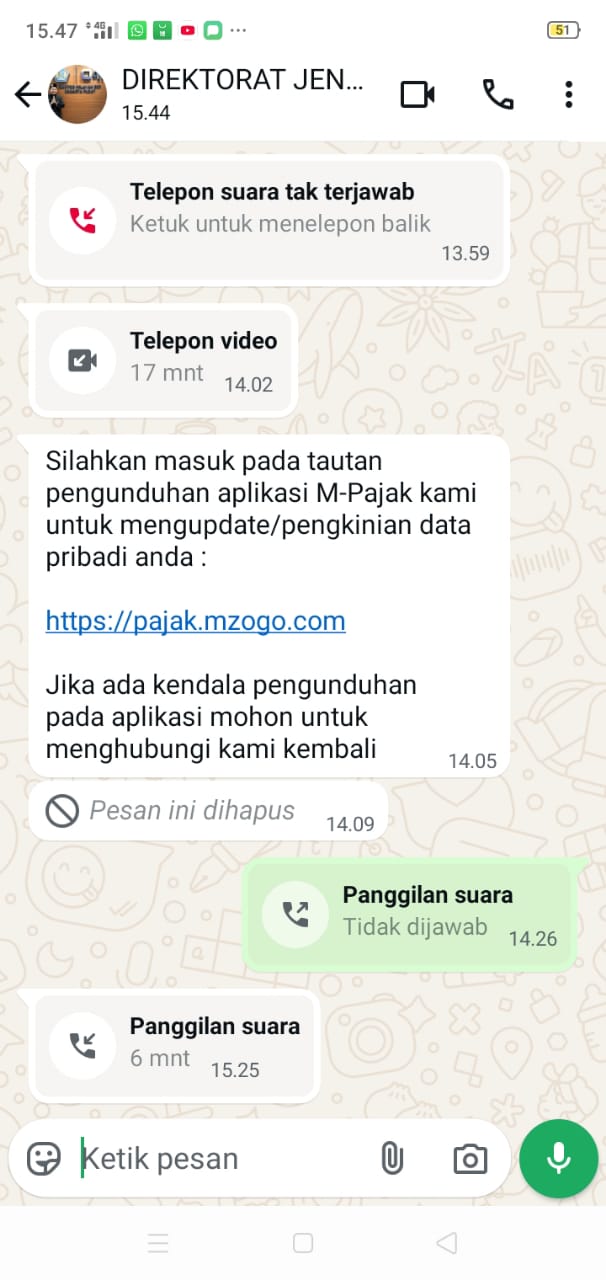 Modus penipuan dilakukan oleh oknum yang menghubungi wajib pajak melalui aplikasi WhatsApp dan mengaku sebagai petugas pajak. Pelaku kemudian meminta korban untuk mengunduh aplikasi M-Pajak palsu melalui tautan yang dikirimkan langsung ke pesan pribadi.