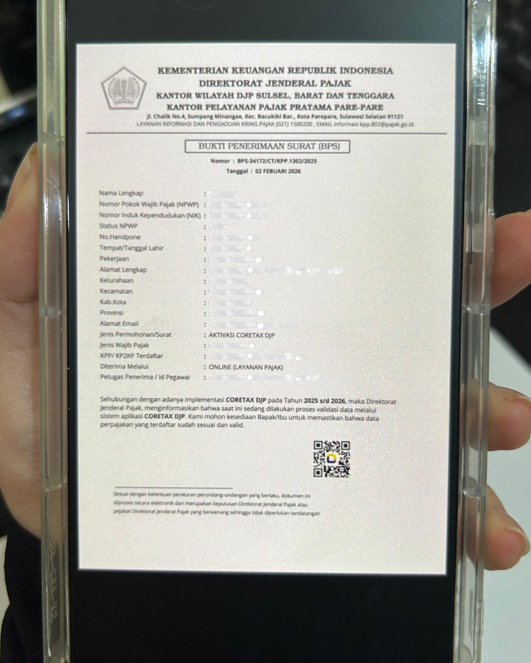 Adriwati mengaku menerima surat melalui WhatsApp yang tampak menyerupai dokumen resmi yang dikeluarkan oleh Direktorat Jenderal Pajak, lengkap dengan data diri wajib pajak dan imbauan untuk segera melakukan validasi data Coretax DJP. Tidak lama setelah menerima pesan tersebut, wajib pajak kemudian dihubungi oleh seseorang yang mengaku sebagai petugas pajak dan meminta sejumlah duit agar proses validasi dapat dilakukan dengan segera.