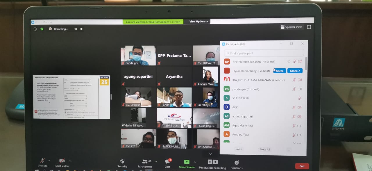 Kantor Pelayanan Pajak Pratama Tabanan menyelenggarakan Edukasi Perpajakan bertema PMK-110/PMK.03/2020 tentang Insentif Pajak untuk wajib pajak terdampak pandemi Covid-19 secara daring melalui Zoom Meeting di KPP Pratama Tabanan (Selasa, 17/11 ).