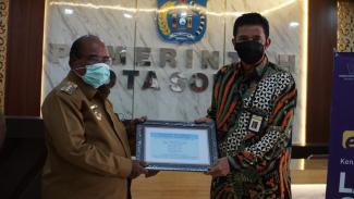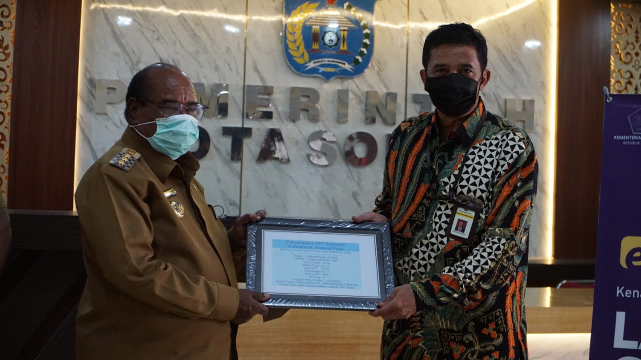 Walikota Sorong Lamberthus Jitmau melakukan pelaporan Surat Pemberitahuan (SPT) Tahunan PPh orang pribadi tahun 2020 melalui layanan e-Filing di Kantor Walikota Sorong (Selasa, 23/2). Dalam kegiatan pelaporan SPT Tahunan melalui e-Filing ini Lamberthus didampingi oleh Kepala Kantor Pelayanan Pajak (KPP) Pratama Sorong Panca Kurniawan dan kepala Seksi Ekstensifikasi dan Penyuluhan KPP Pratama Sorong Imron Rosyadi.