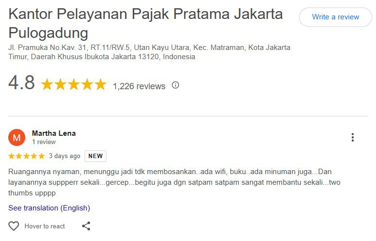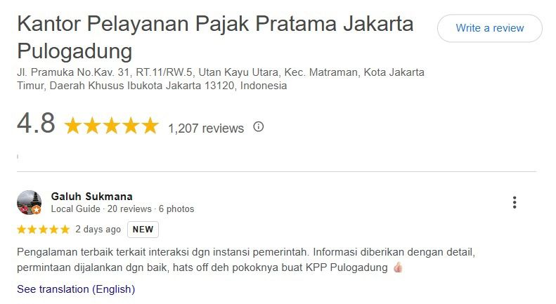 Sementara itu, ulasan lain datang dari Galuh Sukmana, yang menyampaikan, “Pengalaman terbaik terkait interaksi dengan instansi pemerintah. Informasi diberikan dengan detail, permintaan dijalankan dengan baik, hats off deh pokoknya buat KPP Pulogadung.”