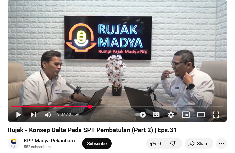 Kantor Pelayanan Pajak (KPP) Madya Pekanbaru kembali hadir menyapa wajib pajak melalui podcast yang membahas topik "Surat Pemberitahuan Tahunan (SPT) Delta pada SPT Pembetulan" ditayangkan dalam dua bagian. Tayangan ini dipublikasikan melalui kanal YouTube resmi KPP Madya Pekanbaru, Kota Pekanbaru (Kamis, 26/6).