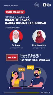 Penyuluh pajak Kantor Wilayah Direktorat Jenderal Pajak (Kanwil DJP) Jawa Tengah I Sri Juaeni dan Rizky Keroshinta menjadi narasumber program Ngobrol Pajak Bikin Hepi (Ngopi) di UP Radio (98.5 FM) Semarang, Kota Semarang (Selasa, 27/4). Tema siaran radio pada episode kali ini adalah Insetif Pajak, Harga Rumah Jadi Murah untuk mengenal lebih dekat insentif yang diatur pada Peraturan Menteri Keuangan (PMK) Nomor 21 Tahun 2021.
