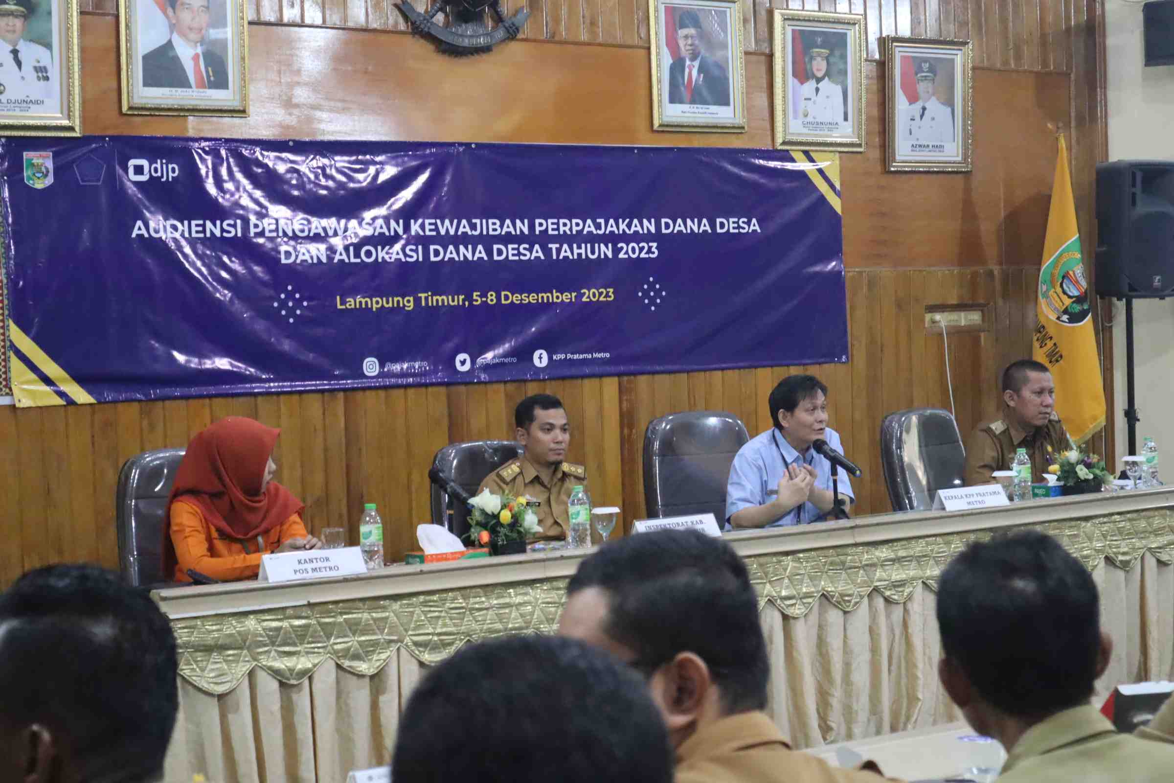 Kantor Pelayanan Pajak (KPP) Pratama Metro mengadakan kegiatan Audiensi Pengawasan Kewajiban Perpajakan Dana Desa dan Alokasi Dana Desa di Aula Badan Pengelolaan Keuangan dan Aset Daerah (BPKAD) Kabupaten Lampung Timur (Selasa, 5/12). Kegiatan yang diselenggarakan selama empat hari sampai dengan 8 Desember 2023 ini dihadiri oleh 466 kepala desa beserta bendahara desa yang berada dalam 24 kecamatan di Kabupaten Lampung Timur.