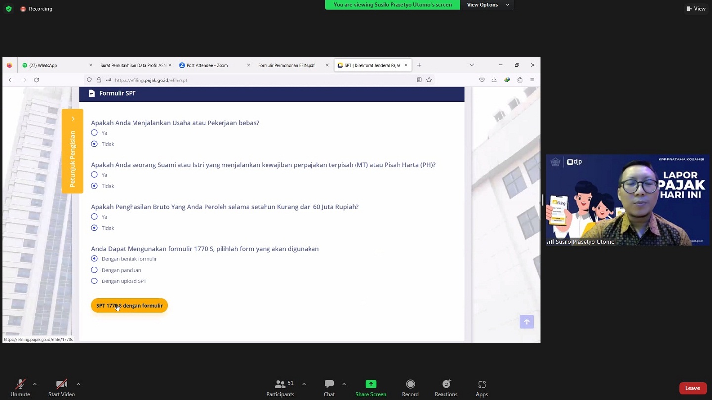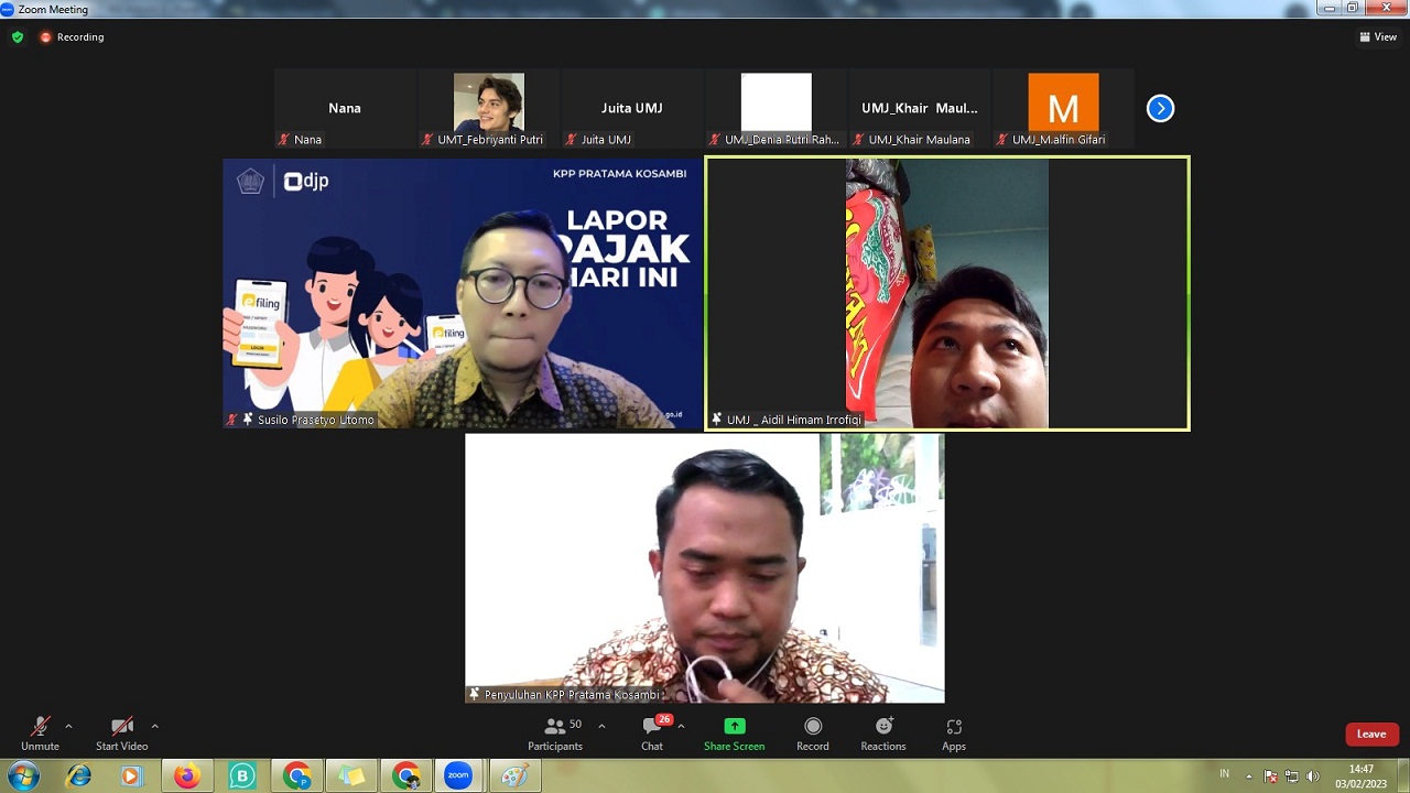 Kantor Pelayanan Pajak (KPP) Pratama Kosambi mengadakan webinar melalui aplikasi Zoom Meeting kepada mahasiswa Universitas Muhammadiyah Tangerang dan Universitas Muhammadiyah Jakarta di Kabupaten Tangerang, Banten (Jumat, 3/2). Webinar diselenggarakan dalam rangka memberikan pembekalan terkait asistensi pengisian dan pelaporan SPT Tahunan kepada para relawan pajak.