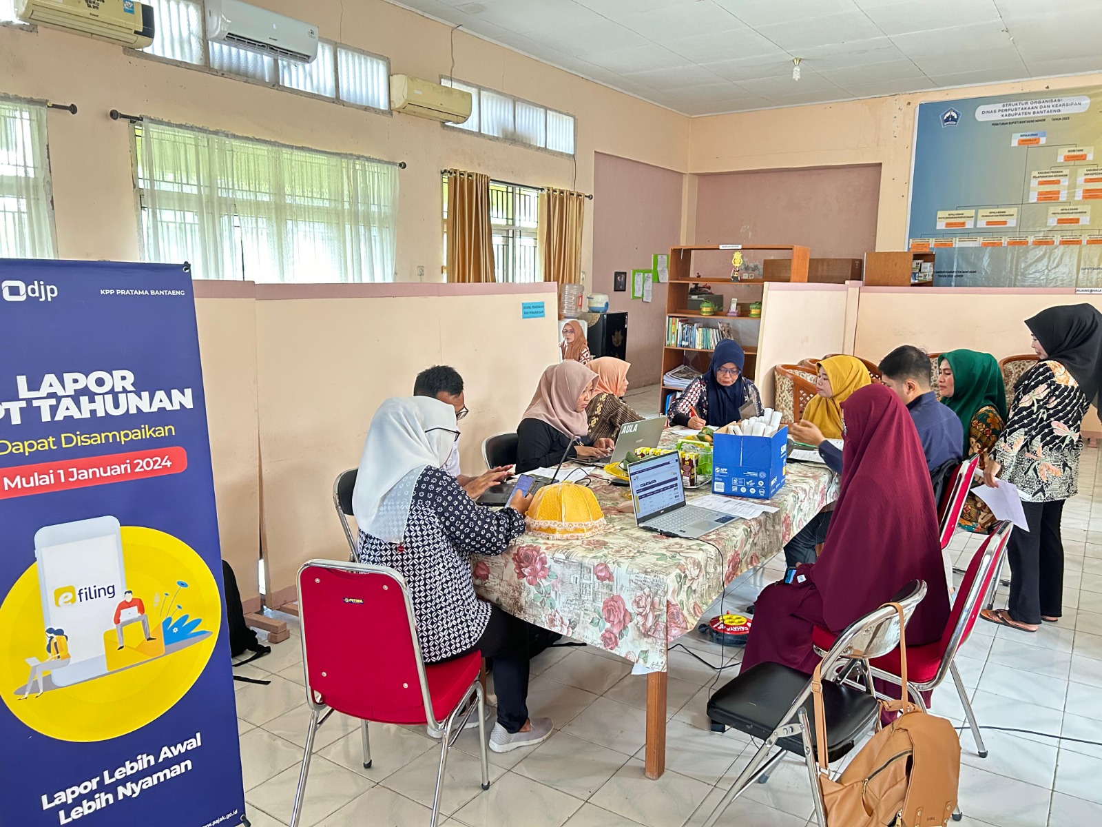 Kantor Pelayanan Pajak (KPP) Pratama Bantaeng mengadakan Pojok Pajak dengan fokus asistensi pelaporan Surat Pemberitahuan (SPT) Tahun 2023 di Kantor Dinas Perpustakaan dan Kearsipan (Dispersip) Kabupaten Bantaeng (Kamis, 11/1). Pojok Pajak ini diikuti oleh seluruh pegawai Dispersip dengan pemateri dari Fungsional Asisten Penyuluh dan Pelaksana Seksi Pelayanan KPP Pratama Bantaeng.