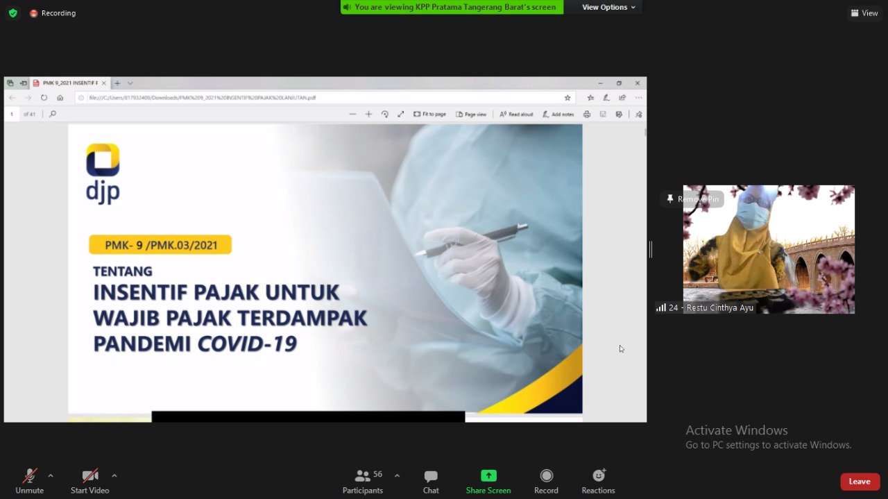 Wajib Pajak Badan mengikuti kelas pajak yang diadakan oleh KPP Pratama Tangerang Barat melalui Zoom Cloud Meeting dengan tema tata cara pelaporan SPT Tahunan untuk badan serta PMK-9/PMK.03/2021 tentang insentif pajak untuk wajib pajak terdampak pandemi Covid-19 (Selasa, 2/3).