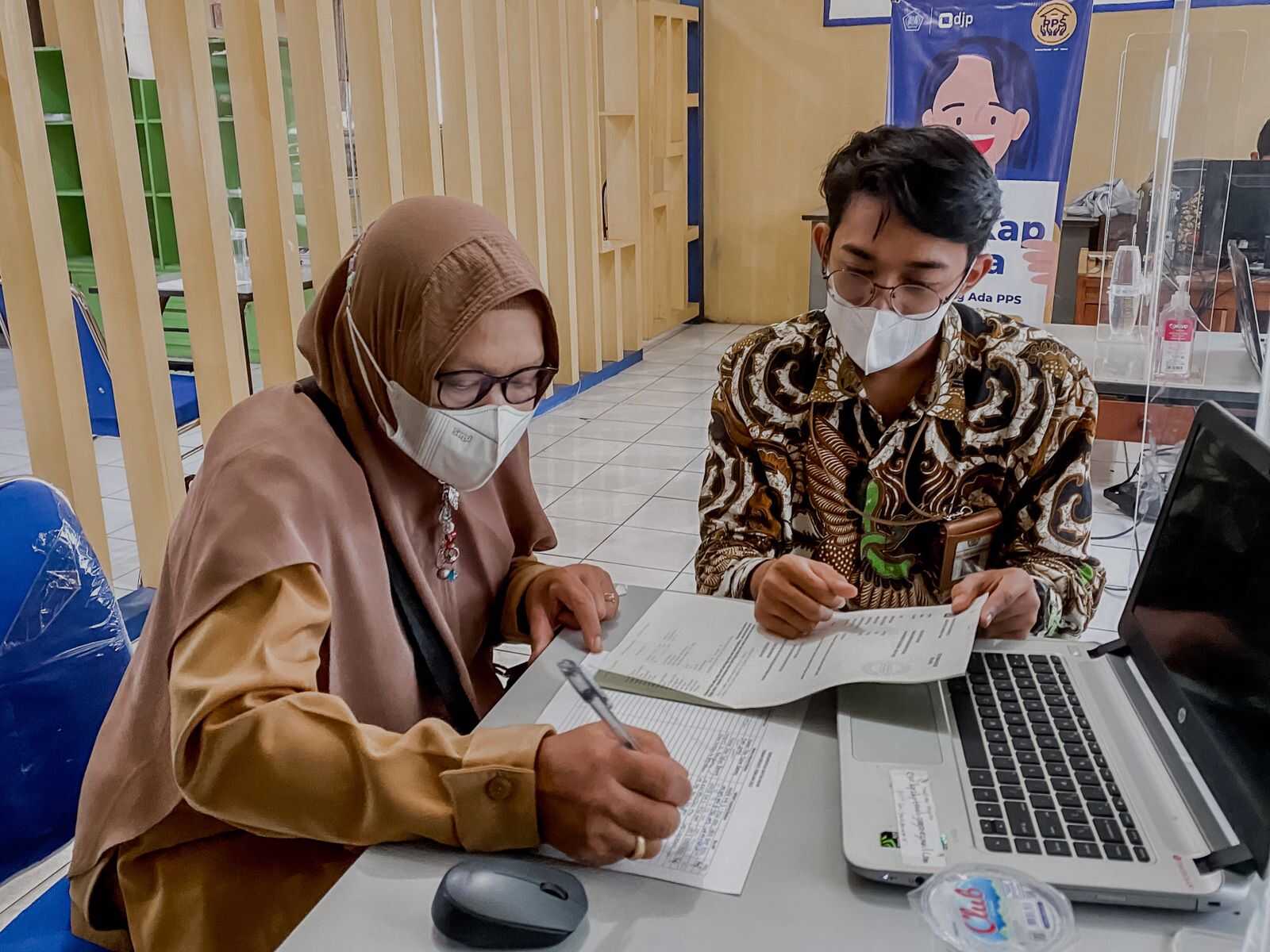 Salah satu petugas Kantor Pelayanan Pajak (KPP) Pratama Penajam Firdan Mukhtar Wahdah memberikan pelayanan asistensi terkait aplikasi e-Bupot serta penyampaian Surat Pemberitahuan (SPT) Pajak Penghasilan (PPh) kepada bendahara Dinas Kearsipan dan Perpustakaan Kabupaten Paser di ruang konsultasi KP2KP Tanah Grogot, Kabupaten Paser (Selasa, 15/2).