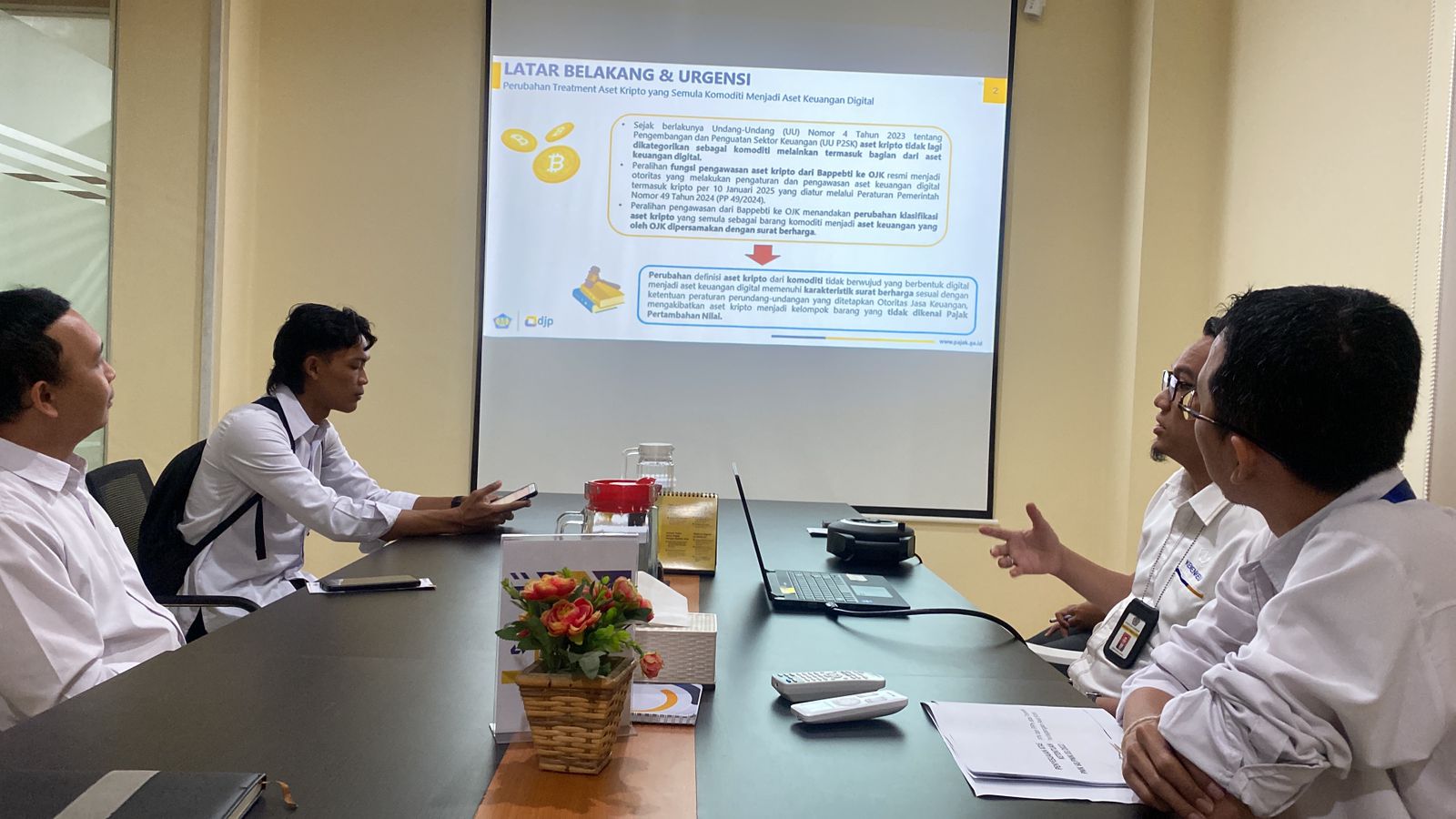Tim Penyuluh Pajak Kanwil DJP Bali turut menerima kunjungan, yaitu Raden Sukma Wardana, Putu Pandu Widiyatmika, dan Mohamad Arif Prasaja. Tim menjelaskan bahwa pokok pengaturan dalam ketentuan tersebut mencakup penetapan status aset kripto yang kini dipersamakan dengan surat berharga, serta pemberian definisi baru atas aset kripto, pedagang aset keuangan digital (PAKD), dan penyelenggara bursa aset keuangan digital termasuk aset kripto (Bursa).