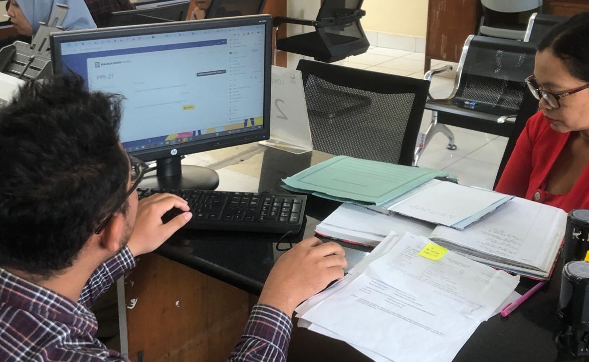 Pelaksana Kantor Pelayanan, Penyuluhan, dan Konsultasi Perpajakan (KP2KP) Amlapura, Baharuddin Khoirul Rizal memberikan asistensi kepada Wajib Pajak Bendahara dalam menggunakan Aplikasi Kalkulator Pajak di KP2KP Amlapura, Karangasem (Kamis, 29/8).