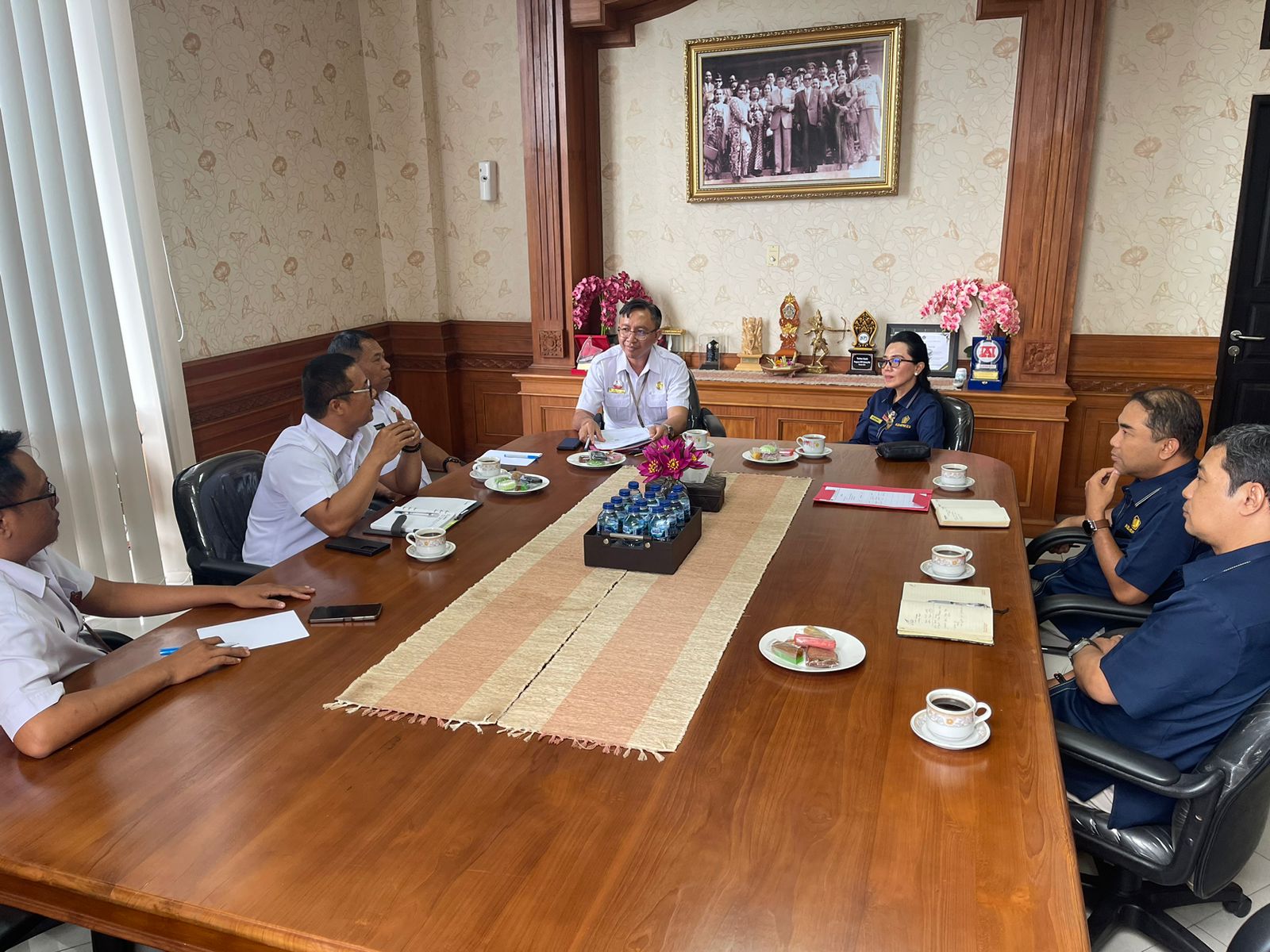 Kepala KPP Pratama Badung Selatan didampingi Kepala Seksi Pengawasan II dan Kepala Seksi (Kasi) Penjaminan Kualitas Data berkunjung secara langsung ke Kantor Bapenda Kabupaten Badung dan disambut oleh Kepala Bidang Penetapan dan Pembukuan Sydrastini, Kepala UPT Mengwi Gede Putu Surya Wisudayana, dan Kasi Pemeriksaan Pajak Daerah.