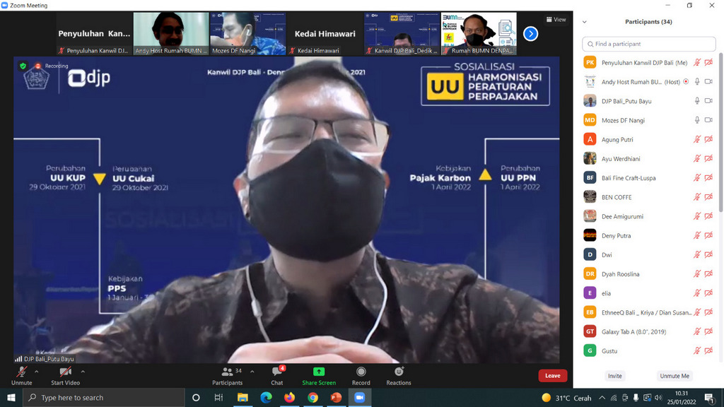 Bekerja sama dengan Rumah Badan Usaha Milik Negara (BUMN) Denpasar, Kantor Wilayah Direktorat Jenderal Pajak (Kanwil DJP) Bali sosialisasikan kewajiban perpajakan bagi pelaku Usaha Mikro Kecil dan Menengah (UMKM) setelah terbitnya Undang-Undang No 7 Tahun 2021 tentang Harmonisasi Peraturan Perpajakan melalui media zoom meeting (Selasa, 25/01).