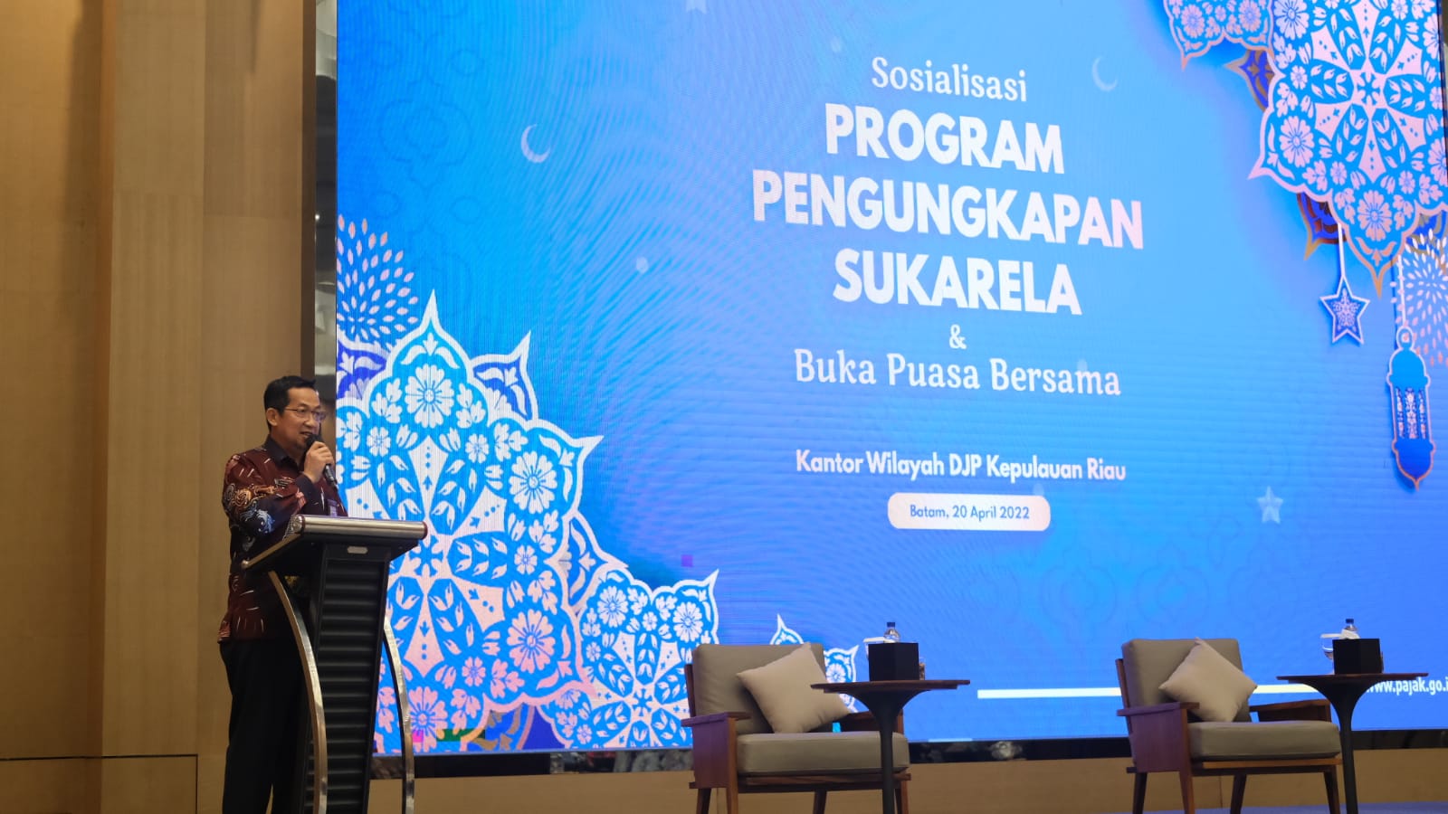 Kantor Wilayah Direktorat Jenderal Pajak Kepulauan Riau (Kanwil DJP Kepri) bersama Kantor Pelayanan Pajak (KPP) Madya Batam, KPP Pratama Batam Utara dan KPP Pratama Batam Selatan mengadakan sosialisasi Program Pengungkapan Sukarela (PPS) sekaligus buka puasa bersama Wajib Pajak Prominen Kota Batam di Hotel JW Marriot Batam, Kepulauan Riau (Rabu, 20/4).
