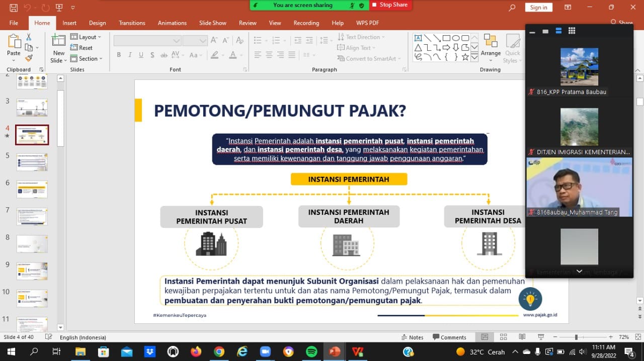 Kantor Pelayanan Pajak (KPP) Pratama Baubau mengadakan bimbingan teknis secara daring menggunakan media zoom meeting mengenai tata cara perekaman e-Bupot Unifikasi dan pelaporan SPT Masa PPh Unifikasi bersama 10 instansi pemerintah bertempat di Aula KPP Pratama Baubau (Selasa, 27/9).