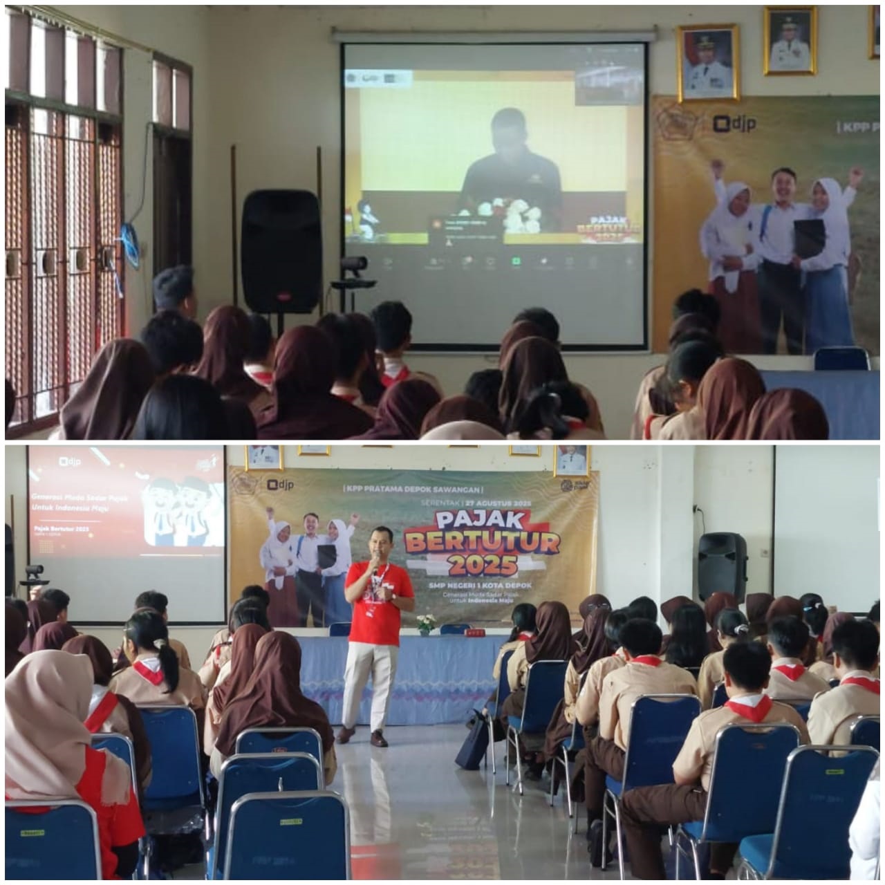 Kantor Pelayanan Pajak (KPP) Pratama Depok Sawangan bersama dengan SMP Negeri 1 Kota Depok menyelenggarakan kegiatan “Pajak Bertutur 2025” (Rabu, 27/8). Kegiatan ini bertujuan untuk memberikan pemahaman dan pengetahuan kepada generasi muda mengenai pentingnya pajak dalam pembangunan negara.
