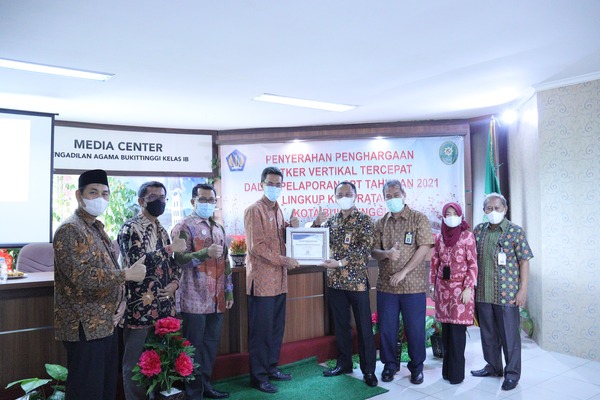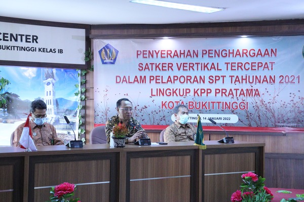 Kantor Pelayanan Pajak (KPP) Pratama Bukittinggi memberikan penghargaan kepada Pengadilan Tinggi Agama Kelas 1B Bukittinggi sebagai satuan kerja (satker) tercepat pelapor SPT Tahunan tahun pajak 2021. Kegiatan ini berlangsung di ruangan Media Center Pengadilan Tinggi Agama Kelas 1B Bukittinggi, Jl. Kusuma Bhakti, Gulai Bancah, Bukittinggi (Jumat, 14/1).