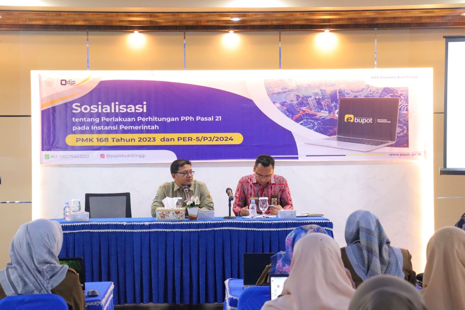 Kantor Pelayanan Pajak (KPP) Pratama Bukittinggi menggelar sosialisasi mengenai perhitungan Pajak Penghasilan (PPh) Pasal 21 yang terbaru. Kegiatan ini ditujukan khusus bagi bendahara instansi pemerintah di Kota Bukittinggi dan dilaksanakan di Aula KPP Pratama Bukittinggi (Selasa, 30/7).