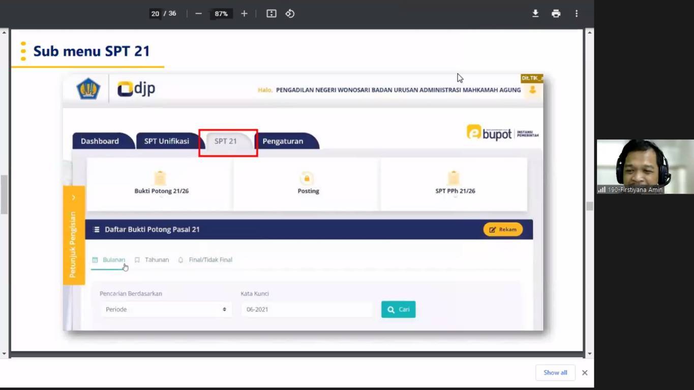 Implementasi e-Bupot Unifikasi dan pelaporan SPT Masa Unifikasi bagi instansi pemerintah mulai berlaku sejak masa pajak September 2021. Penyuluh Kanwil DJP DIY memberikan materi mengenai aturan perpajakan yang berkaitan dengan bendahara pemerintah, e-Bupot Unifikasi dan pelaporan SPT Masa Unifikasi. Penyuluh memberikan tutorial langkah-langkah pengisian data pada aplikasi e-Bupot Unifikasi dan pelaporan SPT Masa Unifikasi sehingga peserta paham secara teknis pengisian.