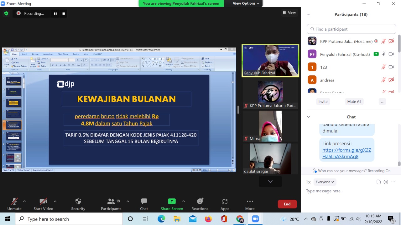 Tim penyuluh pajak KPP Pratama Jakarta Pademangan menyampaikan materi kepada 18 penanggung jawab Wajib Pajak Badan yang terdaftar di KPP Pratama Jakarta Pademangan. Kegiatan dibuka dengan pre-test untuk memahami tingkat pemahaman wajib pajak. Dilanjutkan penyampaian materi tata cara pelaporan daring SPT Tahunan PPh Wajib Pajak Badan oleh Fungsional Penyuluh Pajak. Setelah penyampaian materi, dilanjutkan sesi tanya jawab.