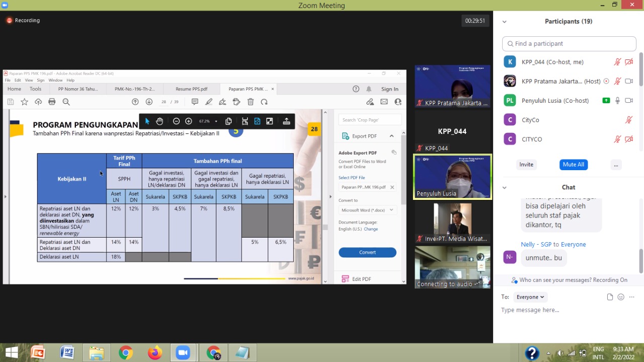 Kantor Pelayanan Pajak (KPP) Pratama Jakarta Pademangan mengadakan kelas pajak Program Pengungkapan Sukarela (PPS) (Rabu,2/2). Kegiatan diselenggarakan melalui Zoom Meeting di ruang penyuluh KPP Pratama Jakarta Pademangan, diikuti 16 Wajib Pajak Orang Pribadi dan Wajib Pajak Badan.