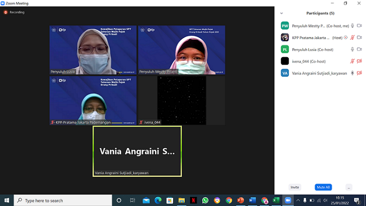 Kantor Pelayanan Pajak (KPP) Pratama Jakarta Pademangan mengadakan kelas pajak dengan tema Kewajiban Perpajakan bagi Wajib Pajak Orang Pribadi secara daring melalui kanal Zoom Meeting di KPP Pratama Jakarta Pademangan (Selasa, 25/1).