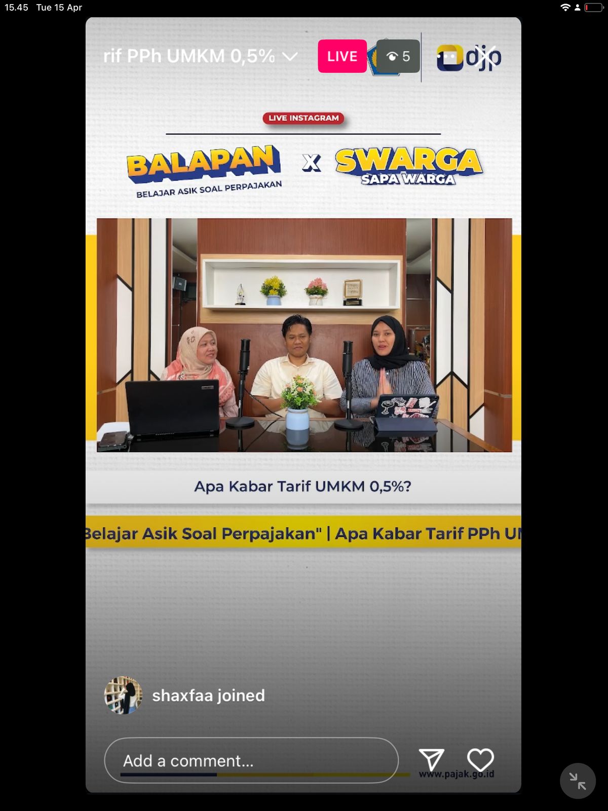 Mengusung tema “Apa Kabar Tarif PPH UMKM 0,5%?”, Live Instagram bulan April ini spesial karena pelaksanaan Swarga dan Balapan digabungkan dalam satu waktu. Sebagaimana biasanya, Balapan akan dilaksanakan pada pertengahan bulan, sementara Swarga dilaksanakan pada akhir bulan. Namun, kali ini keduanya dilaksanakan secara bersamaan pada hari Selasa, 15 April 2025 pukul 15.30 WIB melalui akun Instagram resmi Kanwil DJP Jawa Tengah II @pajakjateng2.