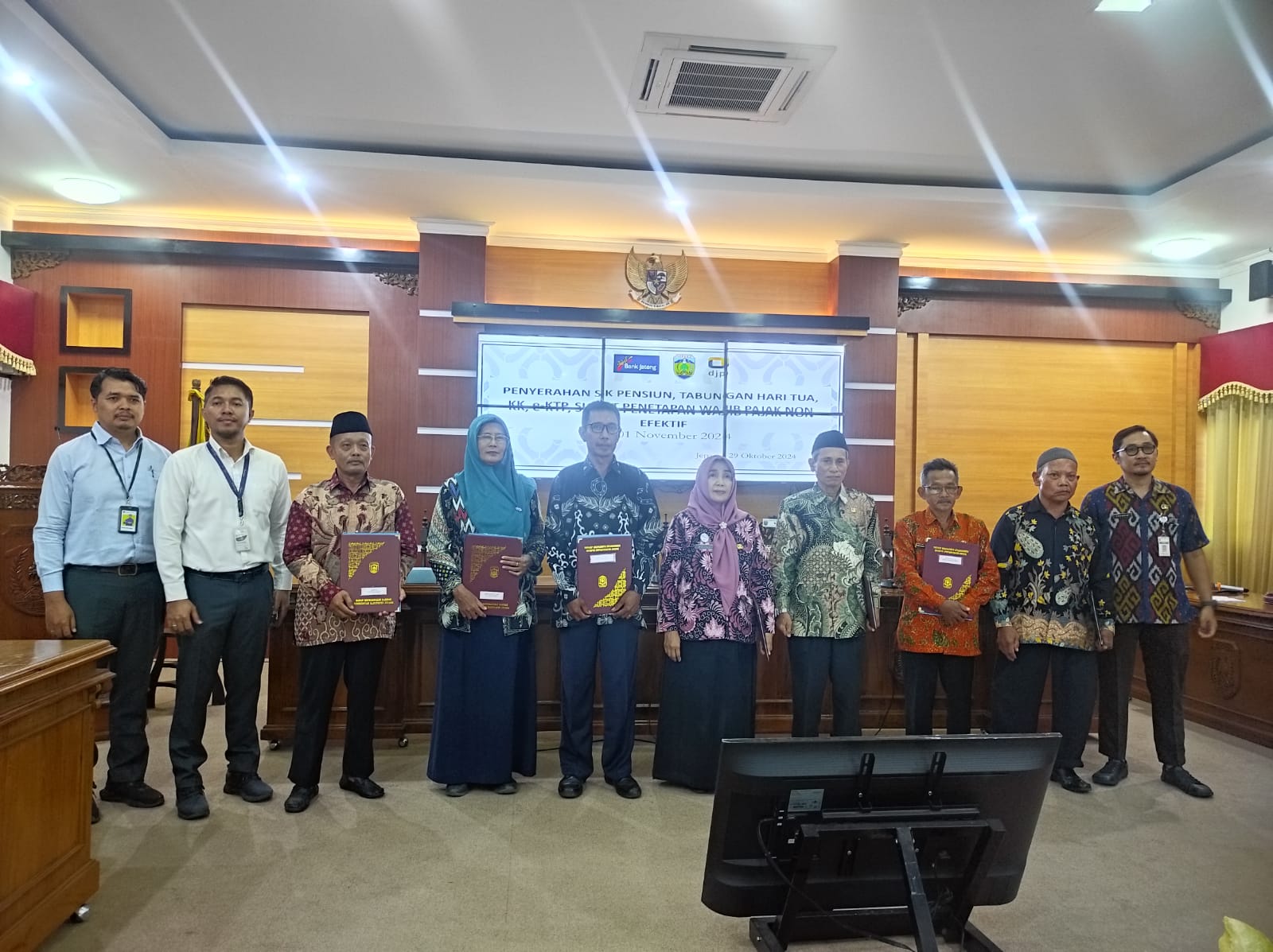 Agenda rutin pensiunan kembali diadakan oleh Pemerintah Kabupaten (Pemkab) Jepara. Berisi penyerahan Surat Keputusan (SK) Pensiun, Tabungan Hari Tua, Kartu Keluarga, e-KTP, dan Surat Penetapan Wajib Pajak Non Efektif, kegiatan tersebut merupakan hasil kerja sama antara Badan Kepegawaian Daerah (BKD) Kabupaten Jepara, Dinas Kependudukan dan Pencatatan Sipil (Dispendukcapil) Kabupaten Jepara, Bank Pembangunan Daerah (BPD) Jawa Tengah, serta Kantor Pelayanan Pajak (KPP) Pratama Jepara. Dilaksanakan di Ruang Rapat RMP Sosrokartono, Gedung BKD pada Selasa (29/10), kegiatan tersebut diikuti oleh sedikitnya 23 (dua puluh tiga) peserta. Para peserta merupakan Pegawai Negeri Sipil (PNS) di lingkungan Pemkab Jepara yang memasuki masa pensiun terhitung mulai tanggal 1 November 2024. 23 (dua puluh tiga) pensiunan tersebut terdiri dari 1 (satu) orang mantan pejabat struktural, 17 (tujuh belas) tenaga pendidik, dan 5 (lima) tenaga fungsional umum.