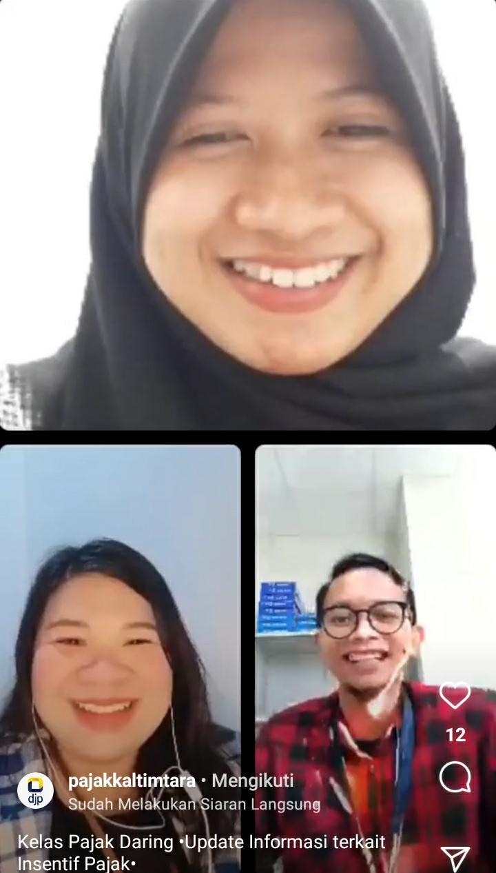 Bahas insentif pajak lagi, Kantor Wilayah Direktorat Jenderal Pajak Kalimantan Timur dan Utara (Kanwil DJP Kaltimtara) update informasi terkait insentif pajak melalui Kelas Pajak Live Instagram di Kota Balikpapan (Kamis, 4/11). Fungsional Penyuluh Pajak Agus Sugianto dan Marlyn Pricillia menjadi narasumber pada kelas pajak ini.