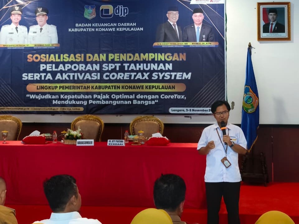 Kantor Pelayanan Pajak (KPP) Pratama Kendari bersama Pemerintah Kabupaten Konawe Kepulauan menyelenggarakan kegiatan Sosialisasi dan Pendampingan Pelaporan SPT Tahunan serta Aktivasi Akun Coretax DJP di Aula Badan Keuangan Daerah (BKD) Kabupaten Konawe Kepulauan, Langara (Senin, 3/11). Reformasi administrasi perpajakan di daerah kepulauan kini memasuki tahap krusial.