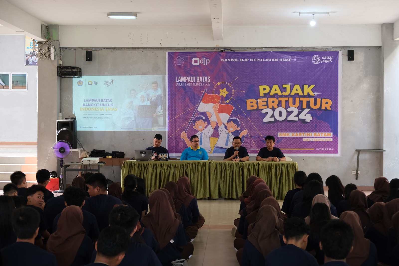 Kantor Wilayah Direktorat Jenderal Pajak Kepulauan Riau (Kanwil DJP Kepri) melaksanakan kegiatan Pajak Bertutur 2024 di SMK Kartini Batam, Kepulauan Riau (Rabu, 7/8). Kegiatan Pajak Bertutur tahun ini dihadiri oleh lebih dari 40 siswa SMK Kartini Batam yang terdiri dari gabungan kelas 11 dan kelas 12 jurusan akuntansi.